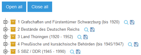 Here, an overview of all inventories stored for the archive, including their position in the archive record group, is displayed in a hierarchical list.