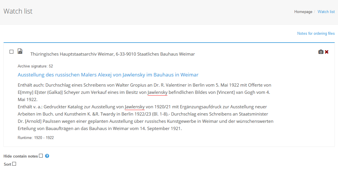 The watch list contains all the information necessary for ordering files: Archive, name of the inventory and archive signature. With these details you can order archival records for inspection in the reading room of the respective archive.